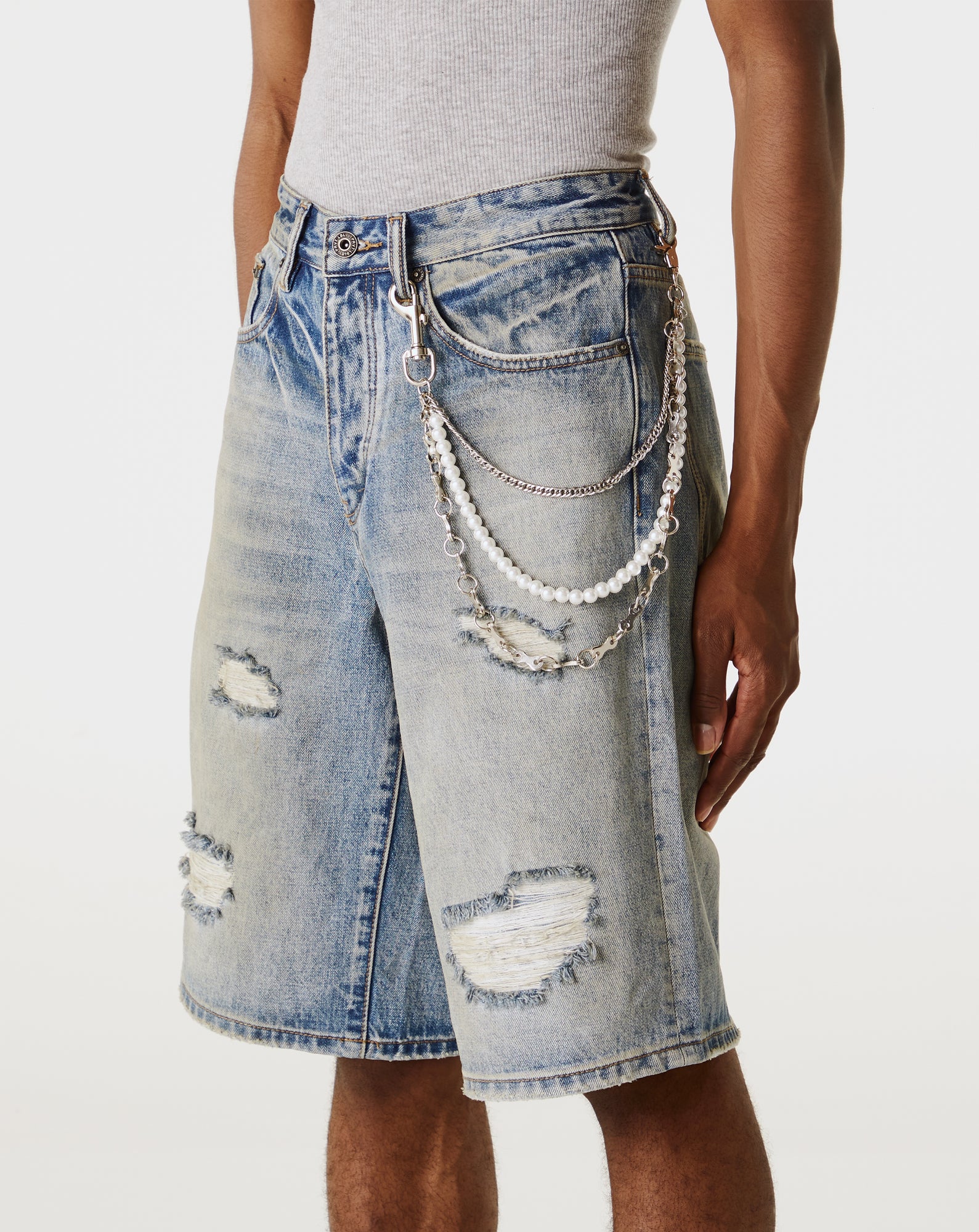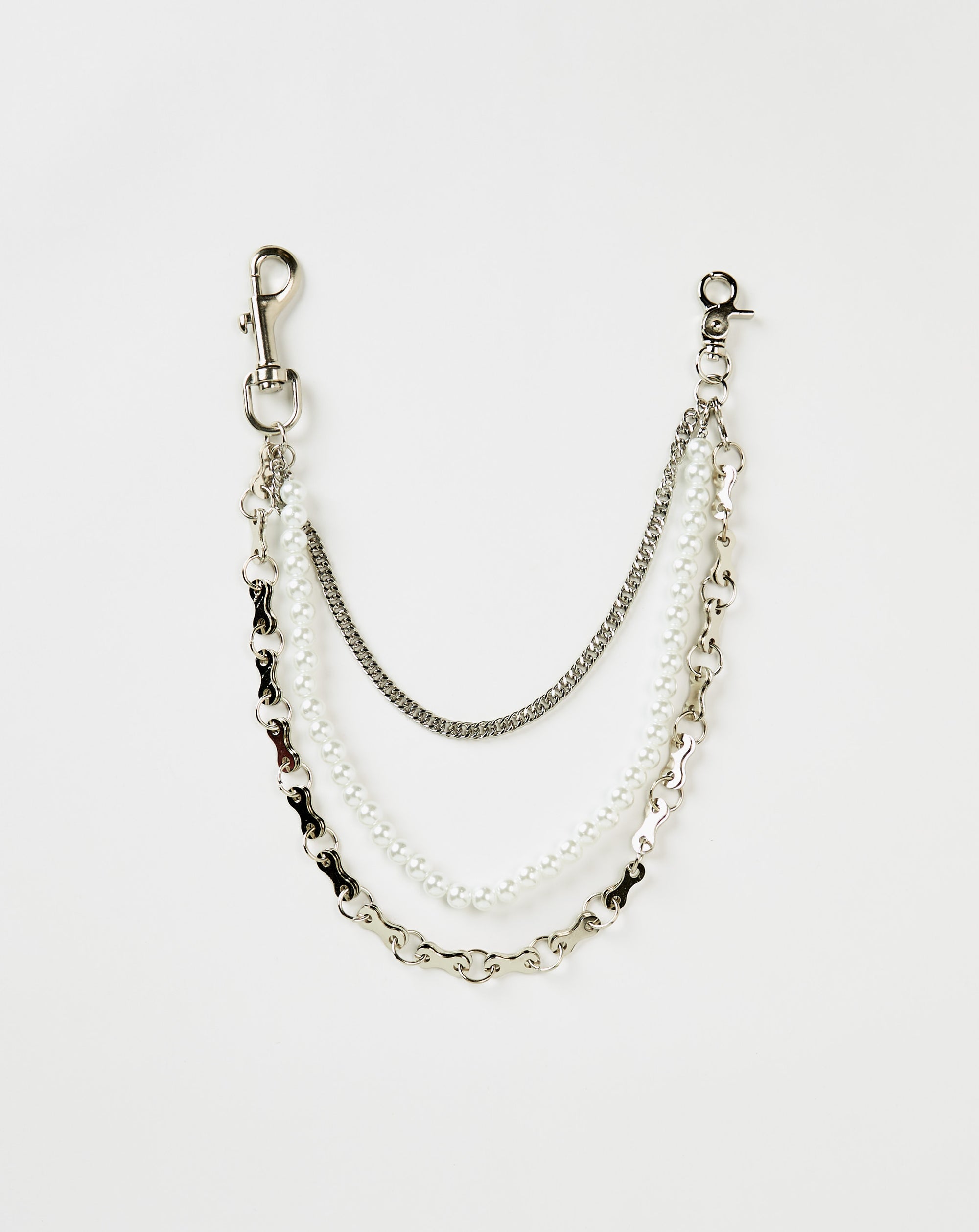The PRVT LBL Wallet Chain Pearl Silver 2 Chain fuses soft pearl elements with silver metal across a layered triple-chain design. Clip and hook closure adds contrast and function to any streetwear fit.